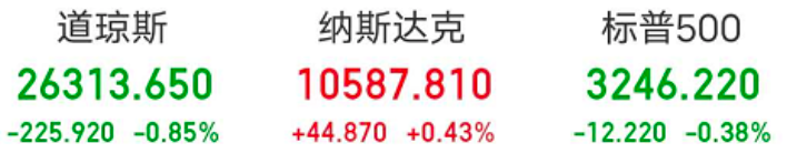 截至收盘,道指跌0.85%报26313.65点,标普500指数跌0.38%报3246.22点,纳指涨0.43%报10587.81点。