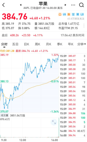 盘后部分美股公司披露财报。苹果公司第三财季营收596.9亿美元,市场预期523亿美元;第三财季iPhone营收264.2亿美元,市场预期213.1亿美元。受此消息影响,苹果盘后涨超6%,首破400美元大关。