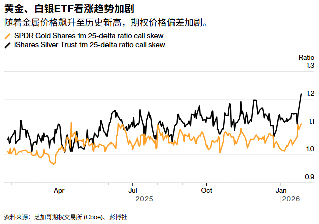 在白银市场,波动率与看涨期权偏度(call skew,即看涨期权相对于看跌期权的溢价)同步大幅飙升。具体交易数据方面:安硕白银信托(SLV)5月到期125美元行权价的看涨期权成交超过3.5万手;同期,纽约商品交易所4月到期、行权价分别为110美元/120美元/130美元/140美元的四档铁鹰式策略(condors)亦成交200手。