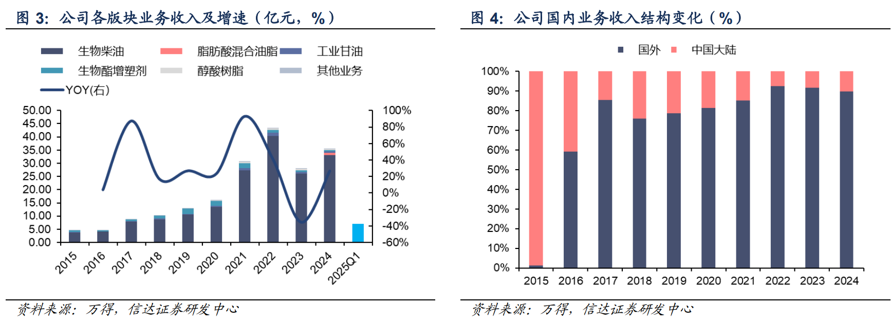 分业务看,公司生物柴油毛利率 2023-2024 年下滑至 10%以下,主要受欧盟反倾销调查和反倾销税影响,2023年主要是由于公司出口价格下降,2024 年主要是由于公司国际跨洋运费和欧洲当地费用增加导致,我们认为随着公司积极调整出口销售渠道以及产品结构,欧盟对公司业绩的负面影响或逐步减弱。另外,生物基材料盈利空间较为可观,随着公司 5 万吨天然脂肪醇在 2025 年 4 月投产调试,我们认为公司盈利能力和产业链附加值或进一步提高。