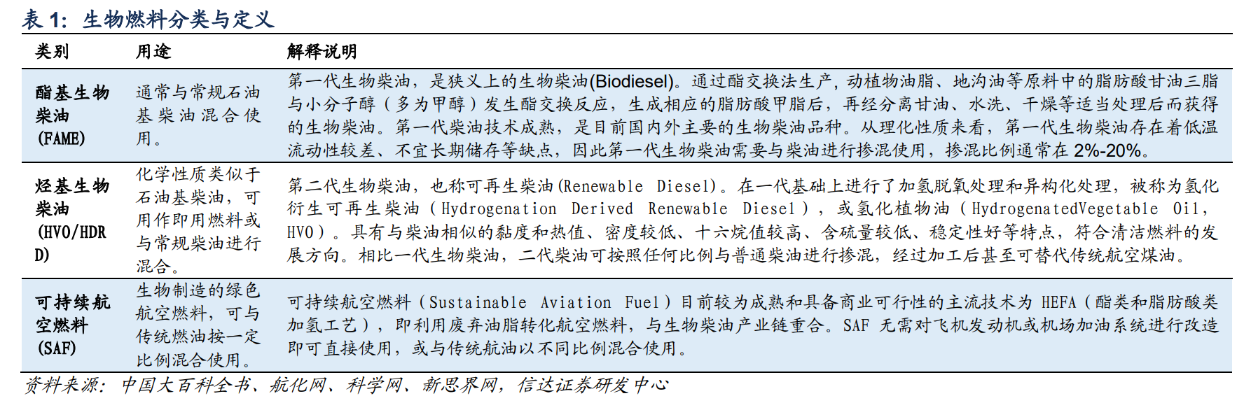 具体到生物柴油和生物航空燃料领域,可分为三类产品:酯基生物柴油(脂肪酸甲酯,fatty acid methyl ester,简称 FAME)、烃基生物柴油(氢化植物油,hydrogenated vegetable oil,简称 HVO/氢化衍生可再生柴油,hydrogenation derived renewable diesel,HDRD)、可持续航空燃料(Sustainable Aviation Fuel,简称 SAF)。