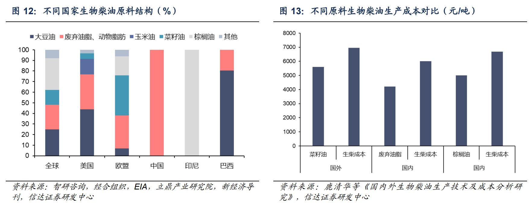 国内外资源差异导致生物柴油生产原料差异较大。生物柴油的生产原料主要有植物油脂(大豆油、玉米油、棕榈油等)、动物油脂(牛油、猪油等)、微生物油脂(微藻及真菌)和废弃无用油脂(包括餐饮和工业废油)四大类。其中,欧盟以菜籽油为主,美洲以大豆油为主,东南亚以棕榈油为主,我国以废弃油脂为主(地沟油杂质多,提纯利用较为复杂),并在价格合适情况下考虑进口棕榈油。原料占生物柴油生产成本的 80%以上,原料不同也导致生物柴油的生产成本差异,其中废弃油脂原料具备明显优势。另外,不同生产工艺路线中,原料油转化率高的装置单位生产成本较低。