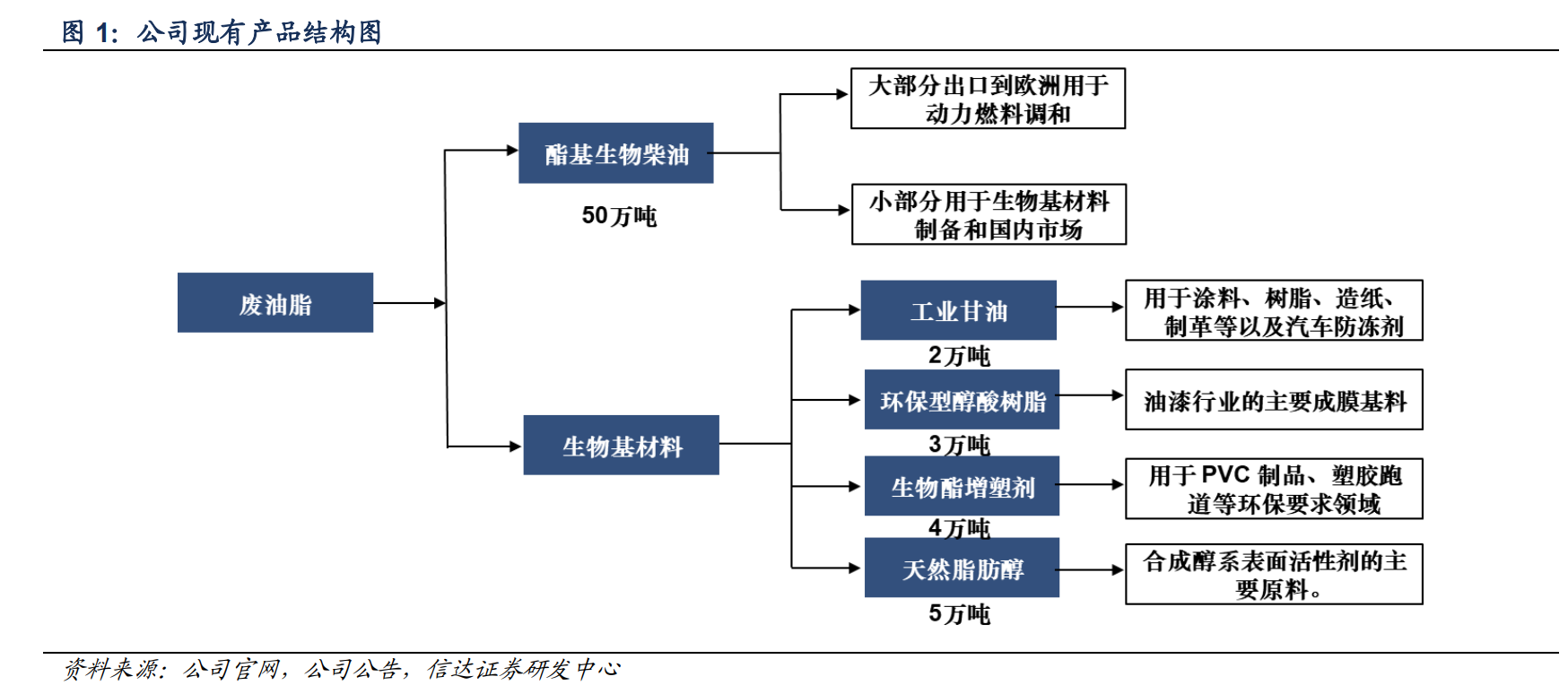 公司于2001年创立,是国内第一家专业从事废油脂制取生物柴油技术研发生产的企业,2019年11月,公司在上交所科创板成功上市。目前,公司已形成以生物柴油为主,衍生深加工生物基材料的“生物质能化一体化”的产业布局,是我国生物柴油行业产能规模大、出口量多、创新能力较强的龙头企业,拥有酯基生物柴油产能近50万吨,环保型醇酸树脂、工业甘油、生物酯增塑剂、天然脂肪醇等生物基材料产能合计14万吨。