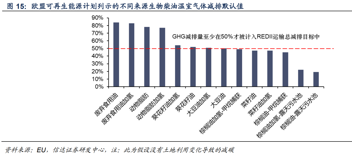 不同原料制备的生物柴油的碳减排量存在差异,以废油脂为原料的生物燃料减排量最高。根据欧盟 REDII(Renewable Energy Directive 2018 年修订版),以废弃食用油(waste cooking oil,简称 UCO)为原料生产的生物燃料的碳减排量相比传统柴油达到 80%以上,以植物油为原料的生物柴油减排量则较低。在欧盟的政策中对于 UCO 基生物燃料的生产消费也给予了更多鼓励,1)若要实现《欧洲气候法》中 2030 年(相比 1990 年)减排 55%目标,以及 REDII 要求交通运输部分温室气体(GHG)减排目标达到 14.5%,根据 REDII,2015 年前投产的生物燃料装置(工厂)生产的燃料要求碳减排量至少在 50%以上,2015 年后投产的在 60%以上,2021 年后投产的在 65%以上,才可计入 14.5%的总目标当中,目前看 UCO 和动物脂肪制备生物柴油能够充分满足这一要求;2)REDIII(2023 年修订)要求以粮食作为原料(crop-based)生产的生物燃料不得超过交通总用油量的 7%。在以上目标减排和掺混限制下,欧盟对 UCO 基生物柴油需求将进一步增长且存在政策倾斜,欧盟RED 规定利用餐厨废弃物(UCO)为原料生产的生物燃料,纳入减排目标时其消费量带来的碳减排量可按照两倍计算。