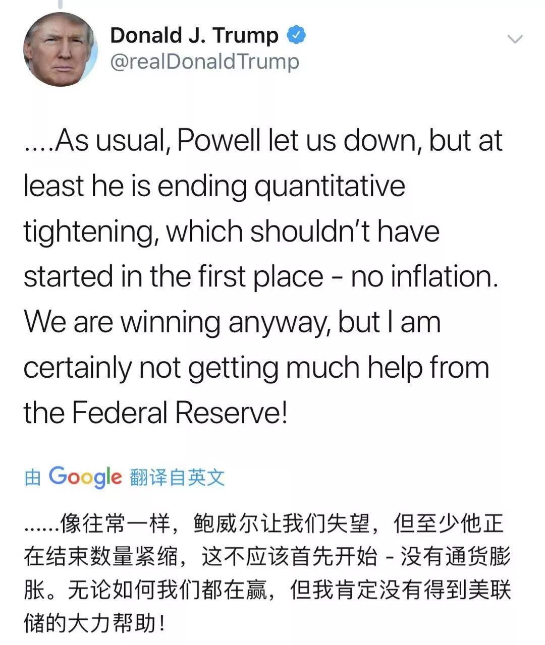 特朗普表示:“和往常一样,鲍威尔让我们失望了,但至少他结束了量化紧缩政策,这本来就不应该开始——没有通货膨胀。我肯定不会从美联储得到多少帮助!”