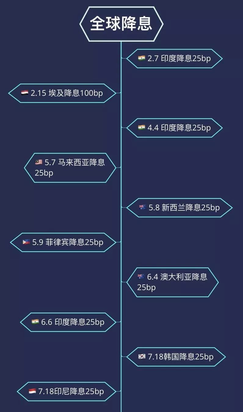 5月8日,新西兰联储实施了自2016年11月以来的首次降息,拉开了发达国家降息的序幕。6月4日,澳大利亚联储宣布降息25个基点,也是近三年来的首次降息,并将基准利率直接降到了历史低位。