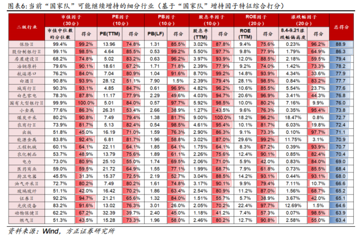 方正证券研报中根据上述特征,构建了当前“国家队”潜在增持行业的打分体系,得分较高的行业主要集中在金融(保险/银行/证券)、资源(煤炭/油气开采)和部分消费(白酒/白电)等领域。