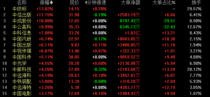 今日午后,中字头板块异动拉升上涨超1%,带动沪指成功翻红。板块内个股中成股份、中公高科直线拉升,完成涨停,中纺标、中信出版涨幅超10%,中科信息、中国汽研、中国出版、中视传媒等快速冲高,涨幅超6%。