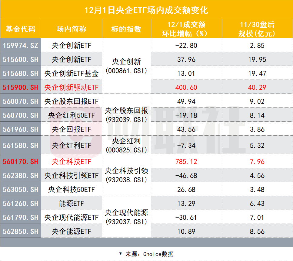 消息面上,据中证报记者获悉,有国有资本运营公司于今日进场买入多家公募基金公司旗下ETF产品。据悉,所购入的ETF产品多为跟踪央企指数产品。从12月1日盘中基金成交情况来看,已有多只央企指数ETF成交额出现大幅增加。其中,最为明显的是博时央企创新驱动ETF和南方中证国新央企科技引领ETF。