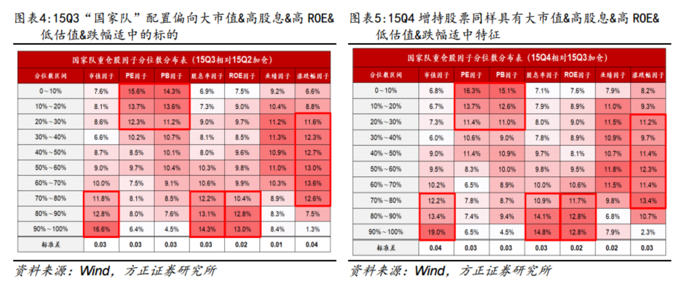 此外,复盘2015年“国家队”增持公司的特征可以看到,15Q3和15Q4“国家队”重点增持的个股大多数位于大市值、高股息、高ROE、低估值、涨跌幅适中的区间。“国家队”更加青睐大盘价值风格并且在“最后一跌”中跌幅相对适中(兼具性价比&基本面)的标的。