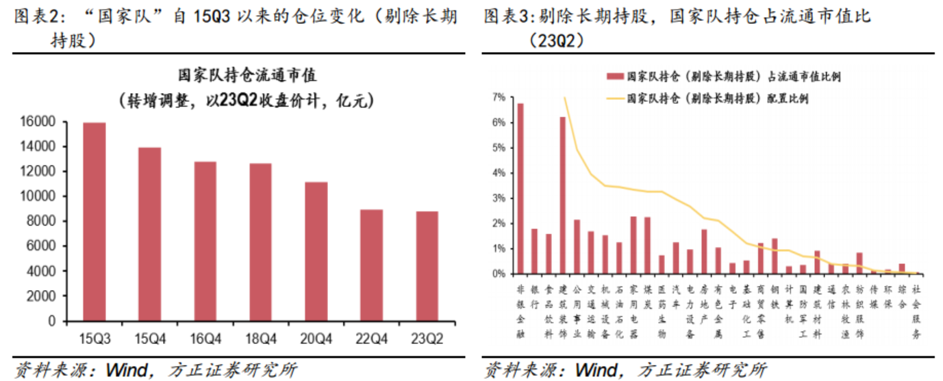 方正证券研报中表示,监管层还没有明确“国家队”潜在的入市资金规模,借鉴2015年三季度“国家队”大规模增持A股,如果以当前的股价折算的话,15Q3“国家队”增持A股流通市值的规模接近1.6万亿元。截止23Q2,“国家队”持有A股流通市值已经不足9千亿元,大致推算“国家队”还有至少7千亿的增持空间。