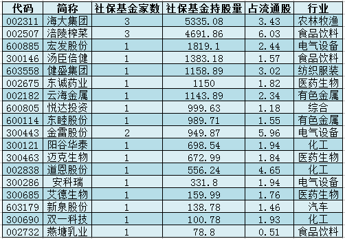 以板块分布统计,社保基金持有个股中,主板有5只,中小板有6只,创业板有7只。所属行业来看,社保基金持股主要集中在医药生物、食品饮料、化工行业,分别有3只、3只、3只个股上榜。