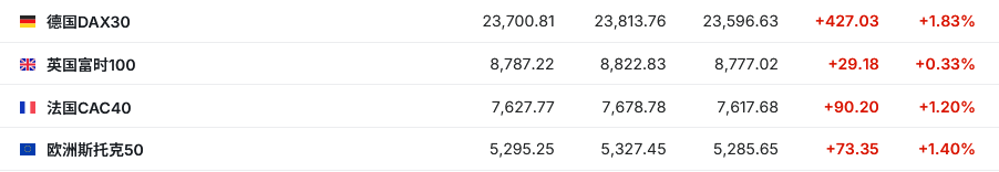 2. 截至发稿,德国DAX指数涨1.83%,英国富时100指数涨0.33%,法国CAC40指数涨1.20%,欧洲斯托克50指数涨1.40%。