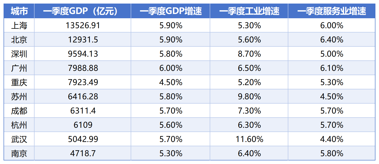 从今年一季报看,十强城市依次是上海、北京、深圳、广州、重庆、苏州、成都、杭州、武汉和南京。十强城市GDP增速分别为5.9%、5.9%、5.8%、6.0%、4.5%、5.8%、5.7%、5.6%、5.7%和5.3%。