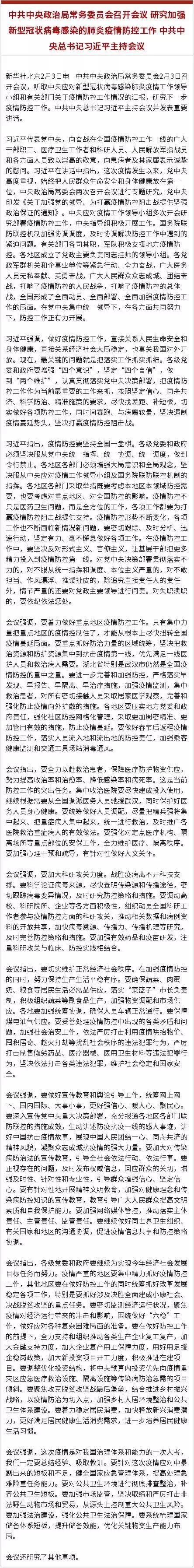 据新华社报道,中共中央政治局常务委员会2月3日召开会议,听取中央应对新型冠状病毒感染肺炎疫情工作领导小组和有关部门关于疫情防控工作情况的汇报,研究下一步疫情防控工作。中共中央总书记习近平主持会议并发表重要讲话。
