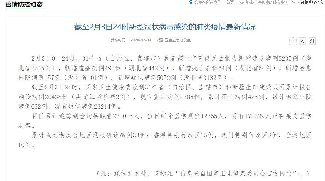 国家卫生健康委员会官方网站显示,2月3日0—24时,31个省(自治区、直辖市)和新疆生产建设兵团报告新增确诊病例3235例(湖北省2345例),新增重症病例492例(湖北省442例),新增死亡病例64例(湖北省64例),新增治愈出院病例157例(湖北省101例),新增疑似病例5072例(湖北省3182例)。