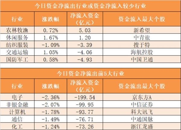 28个申万一级行业中,2个行业实现资金净流入,其中农林牧渔行业净流入5.03亿元居首。