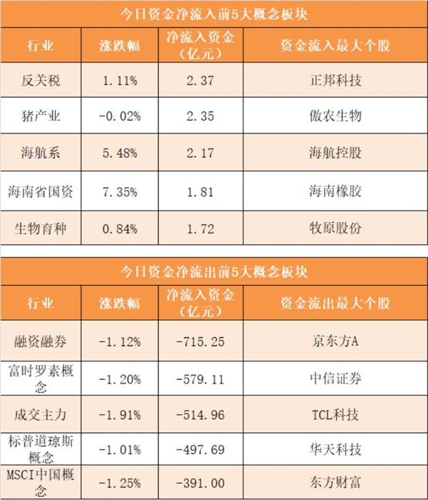 概念板块方面,今日反关税、猪产业、海航系、海南省国资等概念板块资金呈现净流入,其中反关税概念净流入2.37亿元居首。