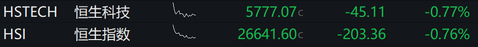 恒生指数跌0.76%,恒生科技指数跌0.77%。医药股、消费股表现疲软,黄金股走高。