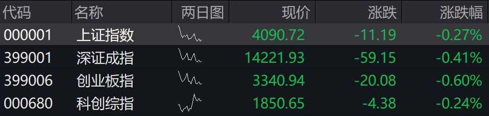 沪指低开0.27%,深成指低开0.41%,创业板指低开0.60%,科创综指低开0.24%。