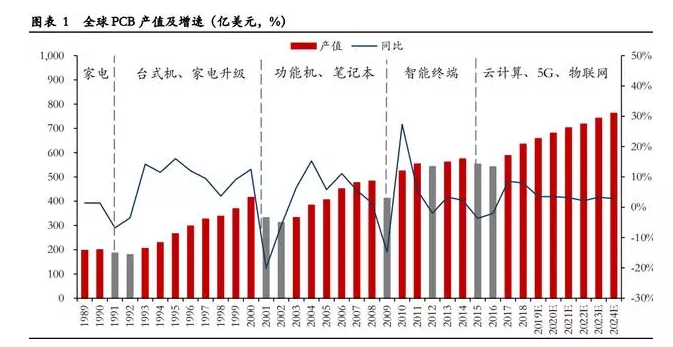 从2017年开始,随着 5G、云计算、智能汽车等新的结构性增长热点的出现,PCB 行业有望迎来新的增长驱动,迈入行业周期发展的第五阶段。