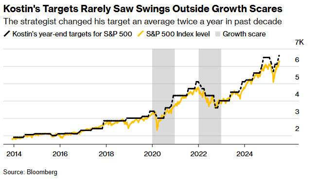 注:黑线为Kostin对2025年标普500的目标值,黄线为标普500实际走势
