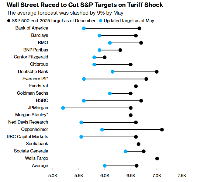 (黑点:华尔街机构去年底设定的目标位;蓝点:5月时设定的目标位)