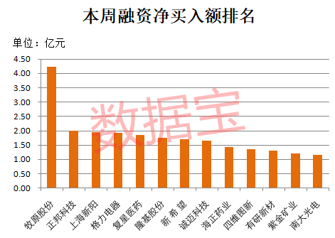 哪些个股获融资客逆市加仓?数据宝统计显示,本周20股获融资客超亿元加仓(由于深交所还未公布周五数据,因此深市个股数据截至周四),较上周减少27只。猪肉概念龙头牧原股份(116.700, -3.43, -2.86%)再获获融资客大手笔加仓,本周融资净买入4.24亿元居首,最新融资余额93.4亿元。近三周牧原股份获融资客净买入额均排在第一位。另一只猪肉概念股正邦科技(18.020, 0.00, 0.00%)融资客净买入2.01亿元排在牧原股份之后,其最新融资余额22.2亿元。