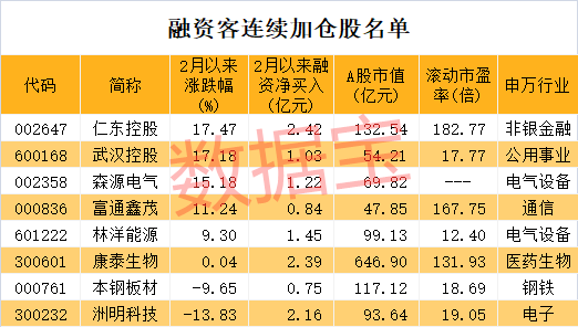 将时间轴拉长,数据宝统计显示,春节以来获融资客连续七周加仓股剩下8只,分别是仁东控股(23.670, 0.02, 0.08%)、康泰生物(100.260, -2.15, -2.10%)、洲明科技(9.530, 0.04, 0.42%)、林洋能源(5.640, 0.07, 1.26%)、森源电气(7.510, -0.17, -2.21%)、武汉控股(7.640, 0.09, 1.19%)、富通鑫茂(3.960, 0.04, 1.02%)、本钢板材(3.370, 0.04, 1.20%)。仁东控股累计融资净买入2.42亿元排在首位。疫苗行业龙头康泰生物累计融资净买入2.39亿元,洲明科技累计融资净买入2.16亿元。具体名单见下表: