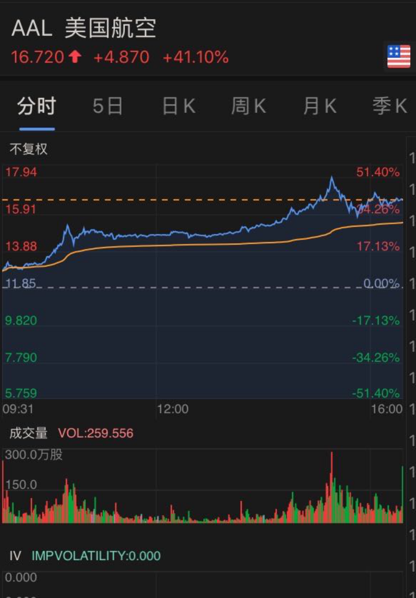 6月的大规模复航计划出台后,美国航空的股价也开始飙升,盘中一度涨超50%,最终收涨41.10%。