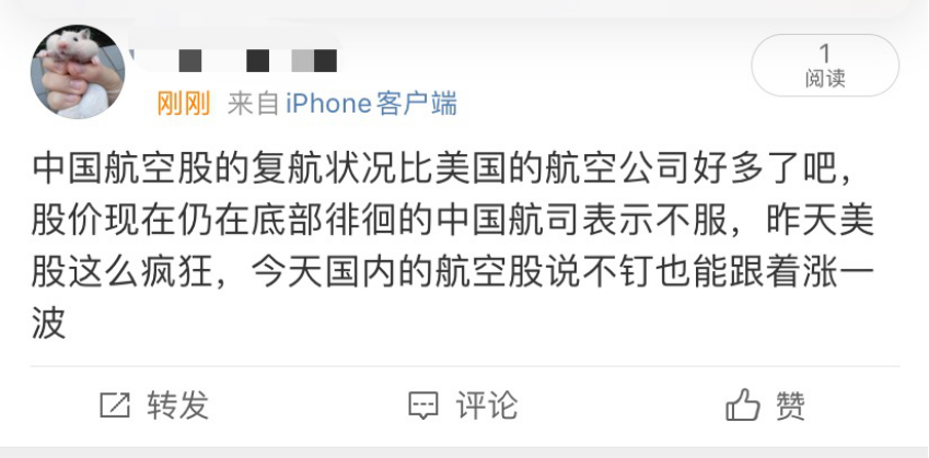 有网友更是为中国航空股打抱不平,觉得中国航空股今天说不定能跟着美国航空股涨一波。