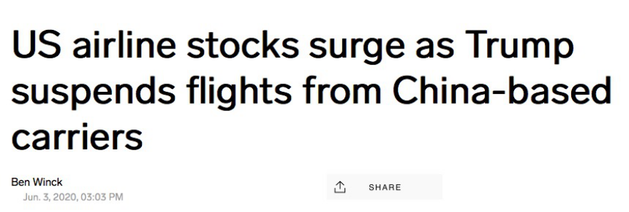Business Insider的文章更是直言美国航司的股票走势迫使特朗普对中国航司“禁飞”。