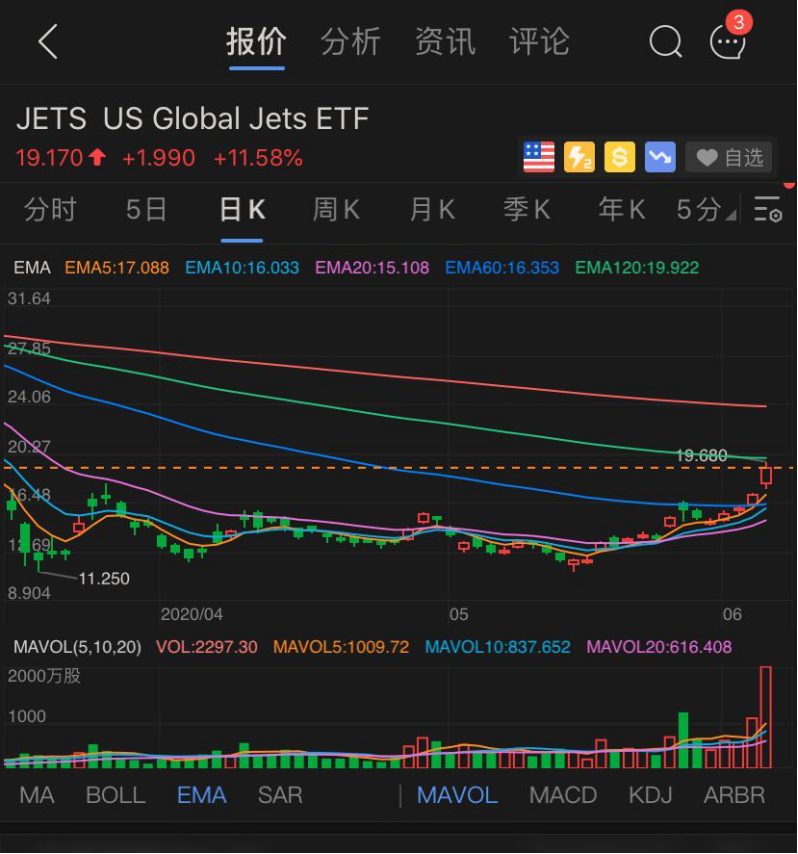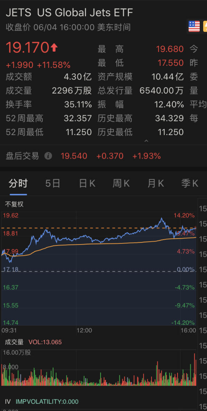 近三个多月规模涨超3000%的航空主题ETF基金Global Jets(JETS)也涨超10%。