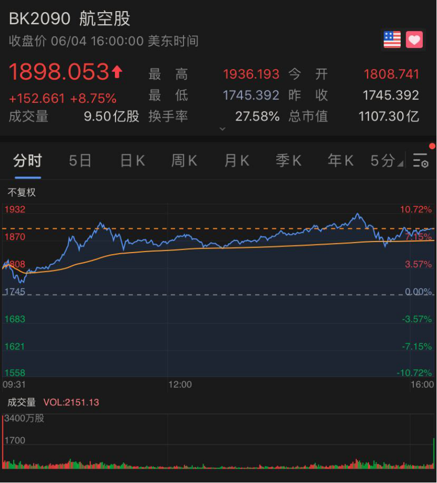 其实,在昨夜大涨之前,美国航空股就已经快“嗨”了。当地时间6月3日,在特朗普对中国航司实施“禁飞令”的背景下,中国民航局推出外国航司复航新政,美国多支航空股大涨,美联航更是涨超10%。