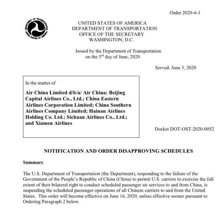 北京时间6月3日晚间,美交通部宣布,自本月16日起,暂停所有中国航空公司执飞的中美定期客运航班,涉及中国国际、南方航空、东方航空等多家航空公司。其声称暂停原因是中国“未能允许美国承运人实现往返中国的定期客运航空服务,无法行使双边权利的全部内容”。