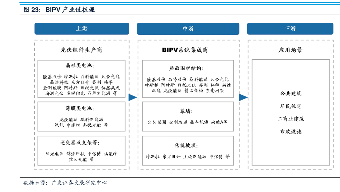 江河集团:幕墙为载体,高端制造业及科技型企业总部建设降碳需求强劲。截至23年末,公司已累计承接BIPV项目金额达13.7亿元,同比+60.4%,2023年,公司光伏建筑项目实现营收7.0亿元。自建湖北光伏组件基地,自用+外销,降本增利。公司通过子公司江河光伏在湖北浠水投建光伏建筑一体化异型光伏组件柔性生产基地项目已于2023年投产。公司有望通过异型光伏组件业务与现有幕墙业务产生协同效应,在满足公司自身承接的光伏建筑项目需要的同时,加大对外销售针对BIPV工程的异型光伏组件产品。