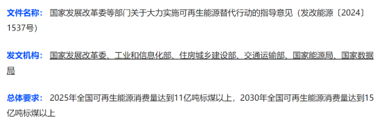2024年10月30日,国家发展改革委等六部门发布《关于大力实施可再生能源替代行动的指导意见》。