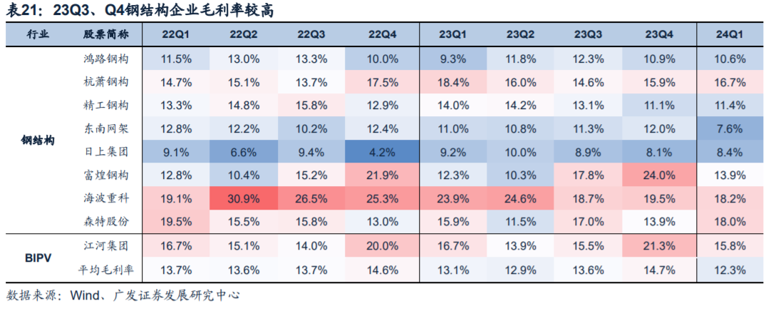 营收端:2023年,多数钢结构企业营收实现稳增,其中鸿路钢构(增速18.6%)、日上集团(增速17.0%)增速位列前2位。24Q1多数钢结构企业营收下降,BIPV企业营收增速较快。海波重科(增速22.6%)、江河集团(增速19.5%)增速位列前2位。