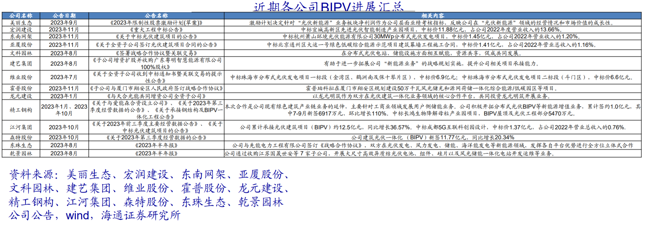 2023年Q1-3,精工钢构、江河集团、森特股份BIPV业务累计新签分别为1.0亿元(7-9月环比增长110%)、12.5亿元(同增36.57%)和11.77亿元(同增20.34%)。