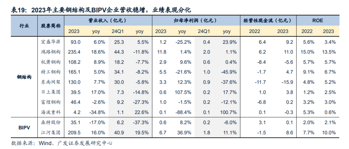 业绩端:2023年,钢结构及BIPV企业归母净利增速分化,其中日上集团(增速107.5%)、江河集团(增速36.9%)位列前2;24Q1分化持续,其中海波重科(增速100.7%)、宏盛华源(增速23.9%)表现较好。现金流端:23年鸿路钢构、宏盛华源、日上集团等多数钢结构企业经营性现金流改善。ROE端:23年东南网架、日上集团、森特股份、江河集团ROE改善。
