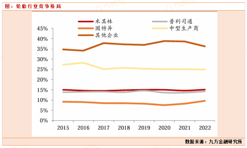2023年全球轮胎消费量17.85亿条左右,主要是替换市场占比较多,目前整个市场需求处于一个稳定增长的状态。世界轮胎行业经过多年发展已经进入成熟阶段,行业集中度高,三大巨头企业 优势地位明显,销售额常年占据行业前三。其中米其林、普利司通、固特异的全球市场份额分别为 15.1%、14.2%、9.6%,而CR10达到了68%,行业集中度进一步提升。我国轮胎行业整体仍呈现大而不强、市场主体规模偏小的局面。在2023年全球轮胎75强中,共有35家中国轮胎企业登上榜单;35家中国企业仅占75强总销售额的19%,但是我国在全球轮胎销量中超50%。目前轮胎行业正处于大变革中,中国轮胎产品,凭借着质优价廉的特点,愈发受欧美消费者青睐,中国轮胎正以性价比加速“全球替代”。