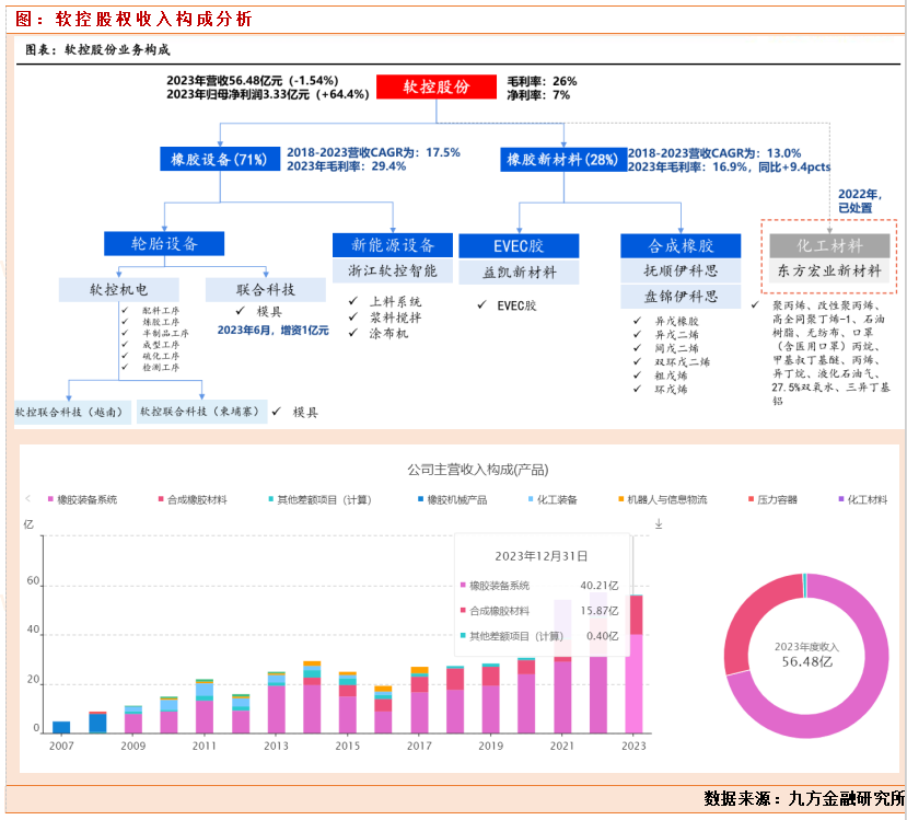 公司业务主要分为橡胶设备和橡胶新材料两大板块。 以公司2023年年报来看,公司橡胶设备业务营收占比71%,橡胶新材料占比28%。双轮驱动公司不断成长。公司的橡胶设备目前基本可以覆盖轮胎生产80%的核心装备。目前已形成较完整的产业链,能够为轮胎生产的配料、密炼、压延、裁断、成型、硫化、检测各个环节提供智能化装备及系统软件服务。公司橡胶新材料产品已涉及碳 五类双烯烃单体、异戊二烯橡胶、EVEC 胶等。为完善和丰富橡胶新材料产业,公司计划从现有产品拓展到上游碳三、碳四、碳五等相关聚烯烃材料、新合成橡胶材料橡胶助剂、石油树脂以及新材料上游单体等。目前公司新材料业务主体为益凯新材料、 抚顺伊科思和盘锦伊科思,截至2023年末,公司橡胶新材料业务拥有15万吨/年碳五分离产品、4万吨/年异戊橡胶和10.8万吨/年EVEC胶产能。