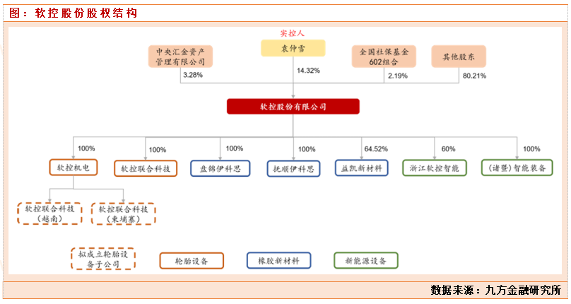袁仲雪先生是软控股份董事长和实控人,同时也是赛轮轮胎(国内轮胎行业龙头企业)的董事长。袁仲雪是国家橡胶与轮胎工程技术研究中心主任,轮胎先进装备与关键材料国家工程研究中心副主任,中国橡胶工业协会高级副会长、企业执行主席等职位,长期致力于面向橡胶轮胎等传统行业的工业自动化、信息化研究,并注重科研成果转化,其在轮胎领域积累的丰富经验和资源持续助力公司发展。 袁仲雪先生直接持有公司14.32% 股份。公司控股子公司较多,其中轮胎设备业务主体主要为软控机电和软控联合科技; 橡胶新材料业务主要集中在盘锦伊科思、抚顺伊科思和益凯新材料。