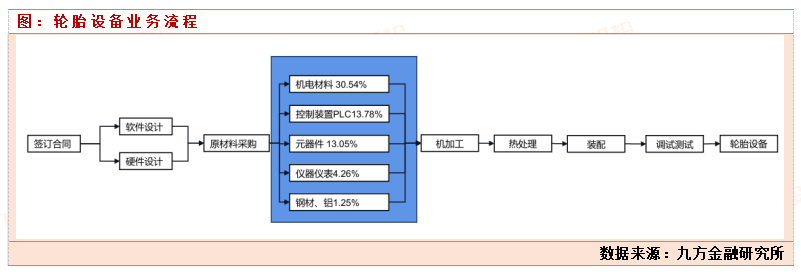 2020年起,美国频繁对东南亚轮胎发起“双反”调查,中国轮胎面临贸易危机。中国头部胎企陆续计划将产能从东南亚拓展至北美(墨西哥)、欧洲(塞尔维亚)、非洲(摩洛哥)等地,进入全球化扩张阶段。轮胎行业目前旺盛的扩产需求有望带动大量的设备需求。据我们不完全统计,未来2-3年中国轮胎海外在建/规划产能超亿条。项目建设中,购置设备是投资金额占比最大的部分,以赛轮轮胎柬埔寨“年产1200万条半钢子午线轮胎”项目为例,项目建设投资预计投入18.8亿元,其中设备购置费用预计为13.5亿元,占比72%,所以轮胎设备行业未来行业景气度必然持续高企。 大多数公司仅生产1-2道工序的相关设备,国内仅有软控股份能实现轮胎生产全流程产品覆盖。截至2024 年三季度末,公司合同负债达47.50亿元,在手订单充足。