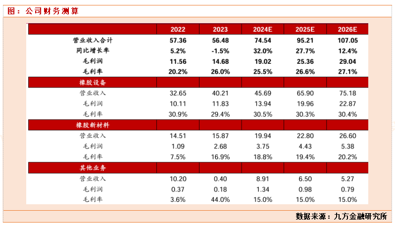 公司主要两大业务橡胶设备和橡胶材料业务,其中橡胶设备占比70%左右。公司目前在手订单充足,到24年3季度,在手已经47亿。根据公司自己的规划,到2025年,争取实现收入突破百亿,我们估计2025年预期橡胶设备这块有66亿收入,橡胶材料有23亿左右。按照公司7%的净利润计算,公司2025年,有望实现7个亿的净利润左右。2024年,前三季度实现营业收入48.79亿 元,同比+32.67%,归母净利润3.43亿元,同比+63.80%; 扣非归母净利润3.06 亿元,同比+82.15%。预期2024年,全年有望实现5个亿的净利润。这两年公司都保持30%以上的增速增长,通过前面我们的分析,主要原因是因为下游橡胶轮胎行业大扩产,景气高企,公司在手订单充足。而目前公司80亿的市值,对于2025年的利润,估值才10倍左右,处于严重低估状态。我们认为市场终究会价值发现,让价值回归会理。