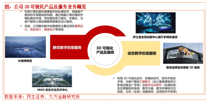 公司3D可视化产品及服务分为“静态数字创意服务”与“动态数字创意服务”,包括3D数字建模、渲染、3D制作技术、软件开发技术,提供3D效果图、三维影片、VR/AR内容、数字沙盘、裸眼3D、数字多媒体交互系统、立体(全息)成像系统等。