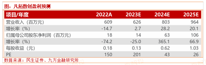公司具备丰富的3D内容制作经验,并储备丰富的三维数据资产。当前MR应用场景以ToB和ToG为主,ToC处于早期,但公司卡位较好,未来受益于设备起量,有望实现3D内容资产的快速变现,此外其内容制作能力也有望快速移植至C端。预计公司2023-2025年实现归母净利润0.14亿元、0.63亿元、1.06亿元。