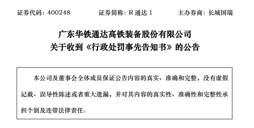 8月21日,R通达1(原“*ST华铁”或“华铁股份”)公告称,公司收到广东证监局下发的《行政处罚事先告知书》,因信息披露违规等事项,公司及相关人员将面临不同额度的处罚。这也是华铁股份在退市后收到的监管“追罚单”。