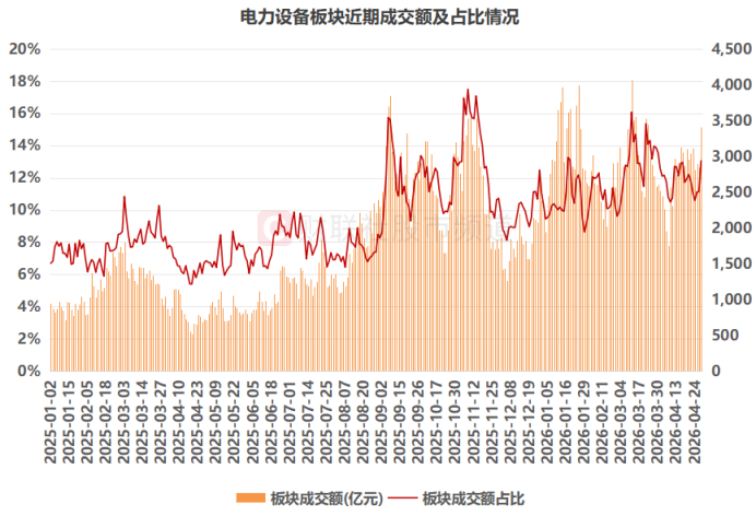 近期,电力设备板块热度攀升,截至今日收盘,其板块全天成交总额达3404.61亿元,创3月中旬以来新高,同时其在整个A股板块中占比达13.05%,为3月末以来近1个月高点。从2025年至今的行情上看,电力设备板块的成交额曾于2025年11月7日一度录得近17.49%的占比数据,为近1年数据的最高纪录。