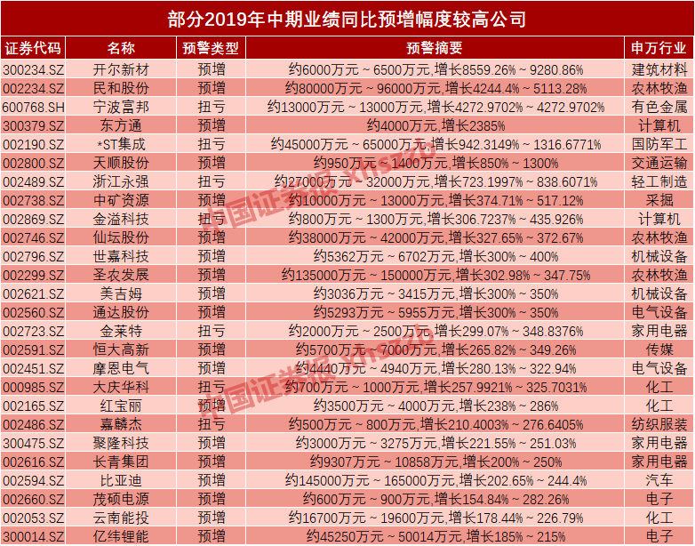 从增幅来看,以业绩预计增幅区间中值计算,205家预喜公司中,66家公司业绩同比预增幅度逾一倍,6家公司预增幅度超10倍。开尔新材中报业绩预增幅度居首,达8559.26-9280.86%,净利润约6000-6500万元。根据公告,公司业绩大增主要因公司订单量持续上升,产品产销量增加,主营业务持续呈现较快增长态势,以及以前年度公司外延式拓展投资效益逐步体现。